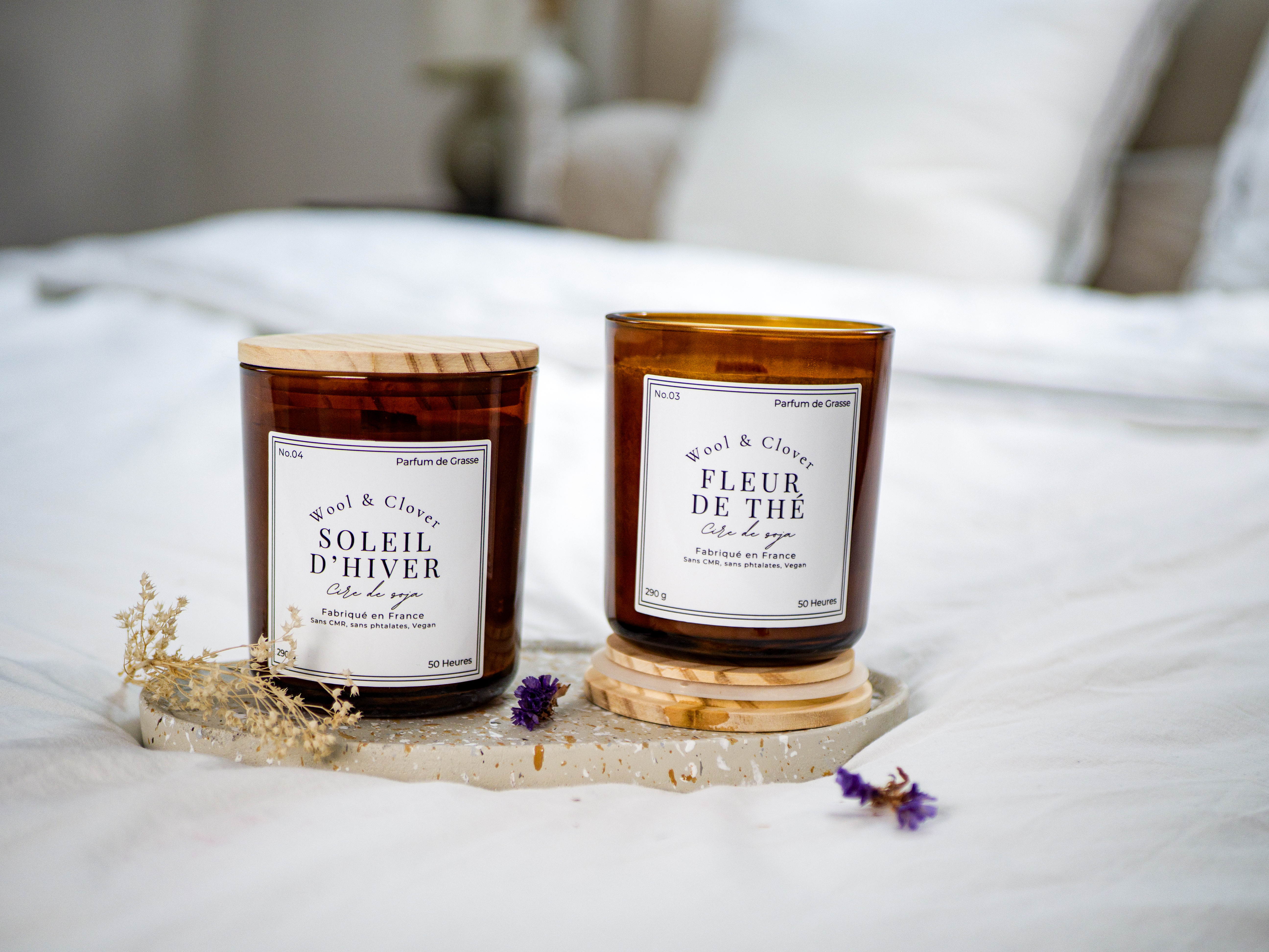 Cires végétales et mèches en bois d'érable pour un crépitement poétique et un sillage sain.